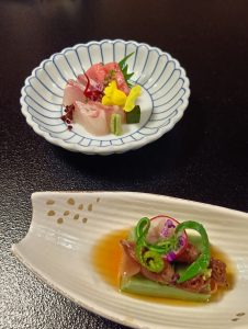 先付けのホタルイカの春野菜のせ、刺身盛り合わせに続いて【ねぎま鍋】の登場。