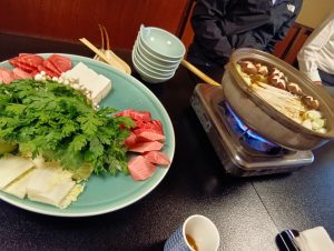 職歴28年という女性が、鍋の出汁にネギ、しいたけ、えのき、白菜、春菊などの野菜、豆腐に火を通してくれるのを「アルコール無しの食事」の手持無沙汰感で待ちます。