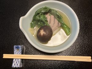 頃合いを見計らってマグロを出汁にくぐらせ、ほど良く脂が落ちたマグロを脇役の具材と共に各人に供してくれること2巡、あっさりと戴きます。
