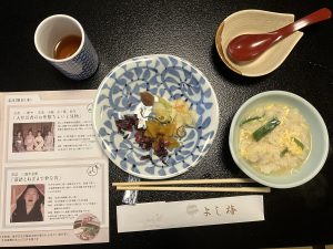 香の物が配膳されて雑炊。卵を溶き入れて、ニラを散らし、火を落としてやや経ってから配られるに、なぜかプロが作る雑炊は、口中大やけどするほどの熱さでした。
